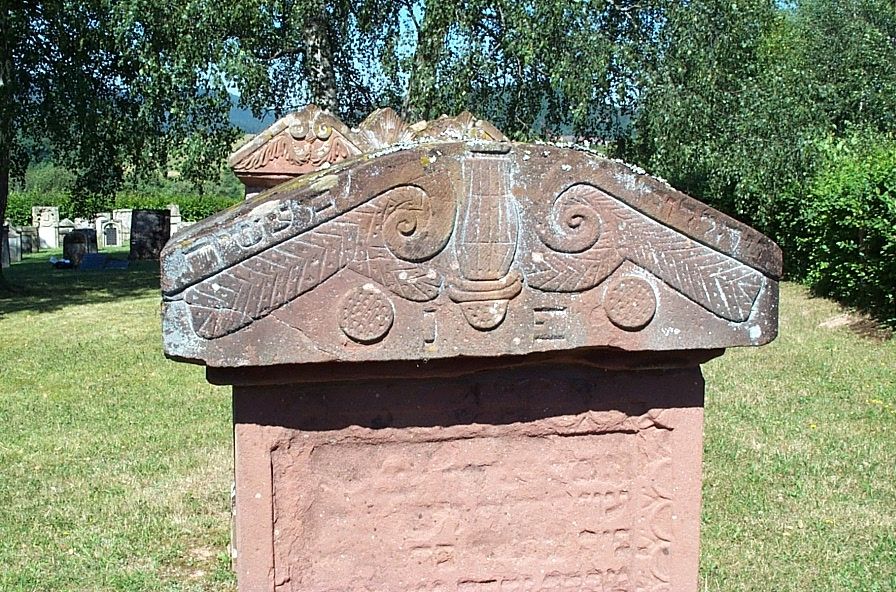 Busenberg, Grabstein der Esther Segal mit Levitenkanne, links und rechts zwei runde Matzen.