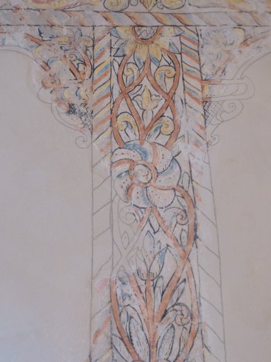 Die Nische des Thoraschreins, der heiligste Ort der Synagoge, ist an der Südostwand noch sichtbar, da sie zugemauert, jedoch nicht verputzt ist. Die Thorarollen wurden hier, entgegen sonstiger Gepflogenheit, in einem Schrein, dem Aron-ha kodesh, an der Längswand aufbewahrt. Bei den z. Zt. durchgeführten gutachterlichen Untersuchungen konnte deutlich gemacht werden, daß die Lage des Thoraschreins verändert wurde. (Endnote 5) Der Fußboden ist in breiten Tannenholzbrettern verlegt. Im Gegensatz zu der sonst beachtlichen Symmetrie fällt auf, daß die Bretteransätze schräg verlaufen. Bei den Vorarbeiten zu dem Gutachten kamen Balken zum Vorschein, die gleichmäßig gesägt waren, während ein Balken nur behauen ist. Da der Umgang mit den entsprechenden Sägen im 18. Jh. noch nicht bekannt war, ist stark zu vermuten, daß dieser eine Balken noch ursprünglich ist; auffallend ist auch, daß er zwischen fest eingemörtelte Steine gelegt worden war. Zwei Rundsäulen stützen einen massiven, durch die Halle verlaufenden Längsbalken. Durch eine viereckige Öffnung kann man von der Frauenempore zur Thoranische hinabsehen. An der Südwestwand und an der Decke sind Fragmente alter Malereien freigelegt worden. Ansonsten sind die Hauptflächen übertüncht; an einigen Stellen sind Reste von Schablonenmalerei zu erkennen.